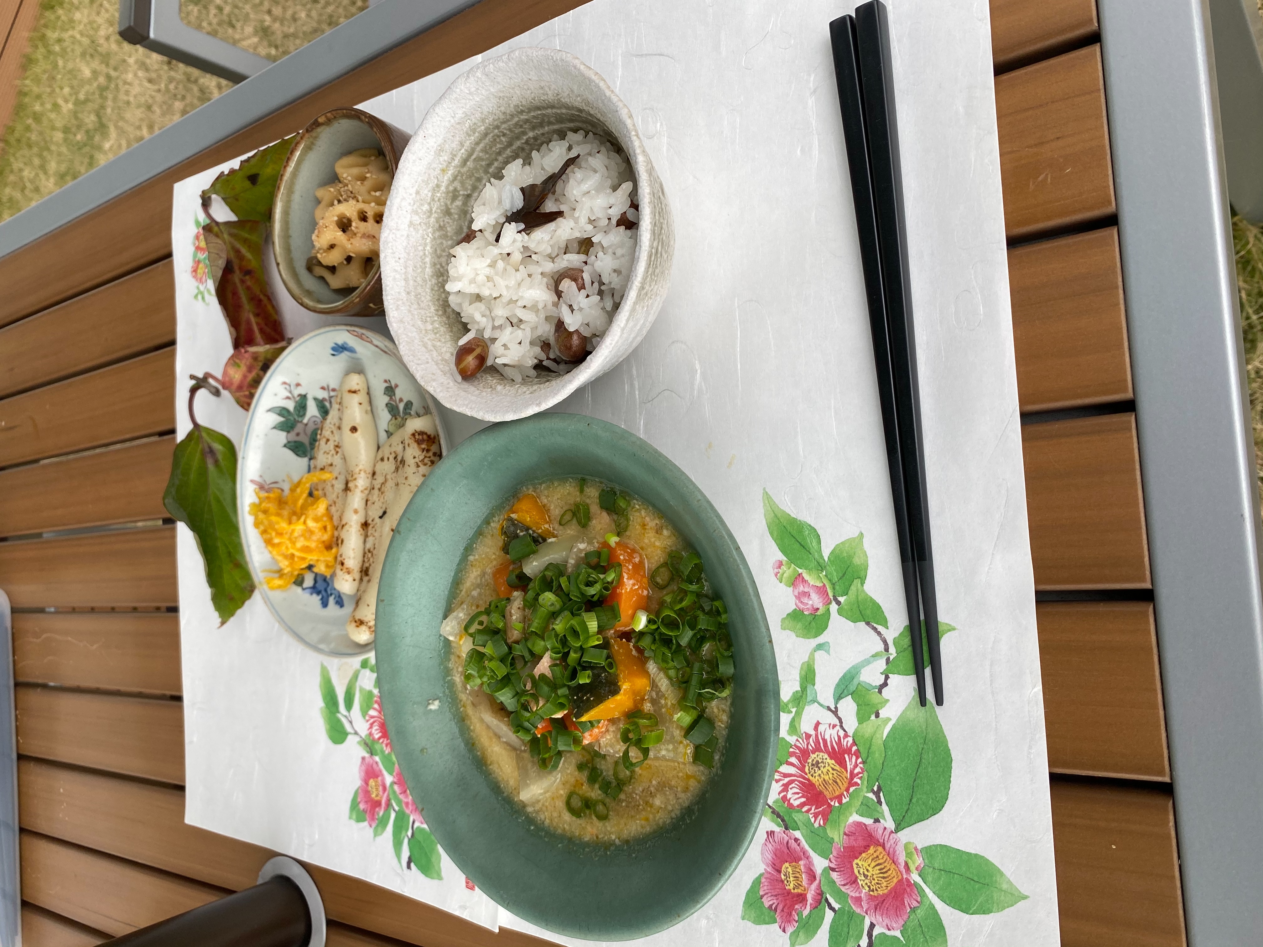 師走の御献立では、南瓜、人参、大根を鮭の粕汁、蓮根を金平、銀杏を御飯で頂きました。